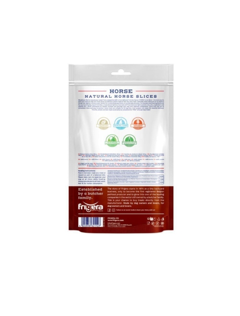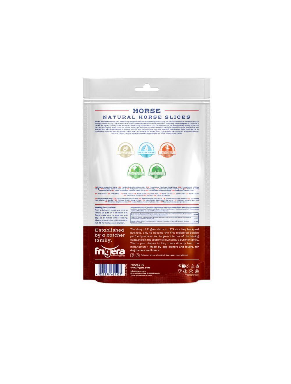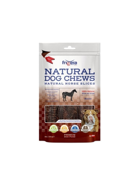 Natural Dog Chews Horse Slices. Disse hestekødsskiver er lækre snacks lavet af det allerbedste kød. De er delikat tørret med ren luft for at skabe en mør, men let sprød snack. Derudover bliver en godbid ikke mere naturlig. Disse skiver har et højt indhold af protein, jern, zink, magnesium og vitamin B12. Da de er skåret i praktiske skiver og nemme at portionere, er disse godbidder velegnede til hunde i alle størrelser. Selv hvalpe kan nyde denne absolutte delikatesse.