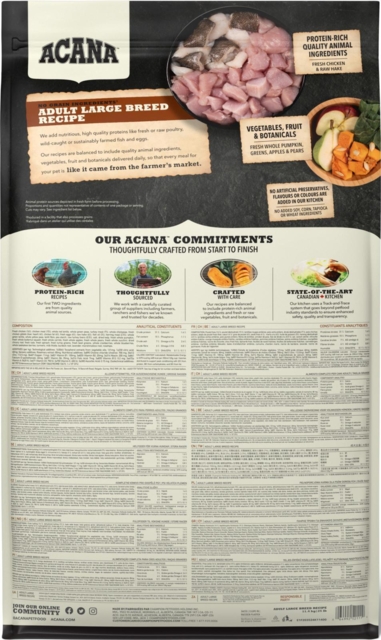 Til store hunderacer over ca. 25 kg. For at tilpasse den store hunds naturlige kost, har Acana Adult Large Breed et højt indhold af naturlige proteiner og et lavt indhold af kulhydrater. Acana Adult Large Breed er et foder fyldt med fritgående kylling, hele æg, friske skrubber fra Vancouver Island, og lækkert frisk indhold af frugt grønt, samt dampet havre med lavt glykæmisk indhold (D.v.s. indeholder IKKE hvede, majs rug, gluten, som ofte kan være en allergifremkaldende faktor i foderet). Alle disse gode ingredienser leveres hver dag friske til fabrikken, d.v.s. indholdet i foderet har aldrig været frosset. Endvidere indeholder Acana Adult Large Breed ingen konserveringsmidler eller andre kunstige tilsætningsstoffer. En vigtig faktor, er også at foderet indeholder store mængder af glukosamin og chondroitin, som mange store hunde kan have glæde af.