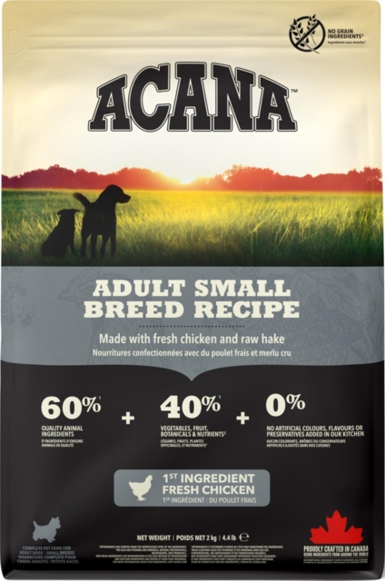 Acana Adult Small Breed er et særdeles sundt og naturligt højkvalitetsfoder med et meget stort kødindhold - hele 60%, bestående af kylling og laks. Endvidere stort indhold af frisk frugt og grøntsager samt dampet havre. Acana hundefoder består kun friske råvarer, derfor ingen konserveringsmidler. Denne fantastiske sammensætning sikrer det optimale, sunde foder til voksne hunde af små racer.