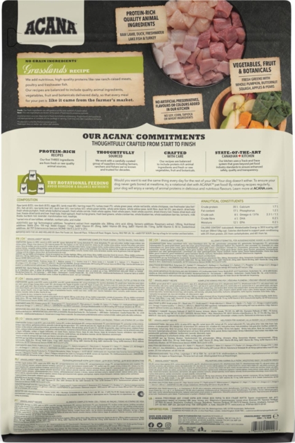 Acana Grassland er all life stages hundefoder, og kan derfor benyttes til både hvalp, voksen og senior hund. Grassland er sammensat på en måde, at indholdet er så tæt så muligt, på de ting som hunden selv ville finde som foder, hvis den gik frit i naturen, og selv skulle skaffe føden. Foderet indeholder frilands lam, frilands and, hele æg og vildtfanget fisk, og desuden også lækre grønsager, bær, urter m.m. Alt sammen er lavet af de bedste og mest friske ingredienser.