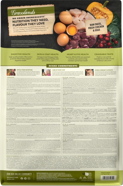 ACANA™ Highest Protein Grasslands Dry Cat Food til killinger og voksne katte er inspireret af de store græsarealer og kolde nordlige søer. Fremstillet med kvalitetsingredienser fra små byttedyr, såsom rå and, fersk kylling, æg og ingen korn.