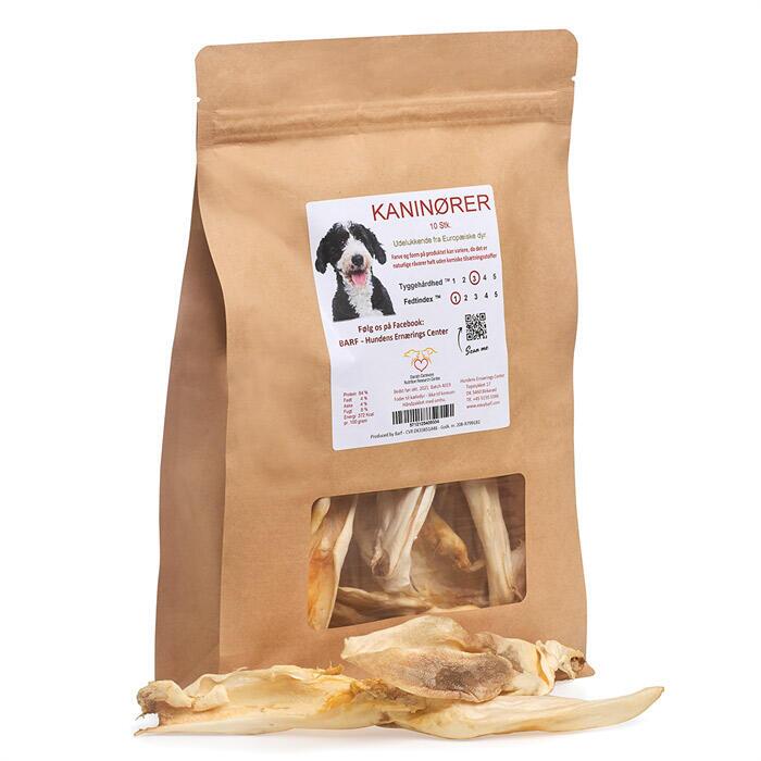 - Indeholder hele tørrede kaninører fra friskslagtede europæiske kaniner.