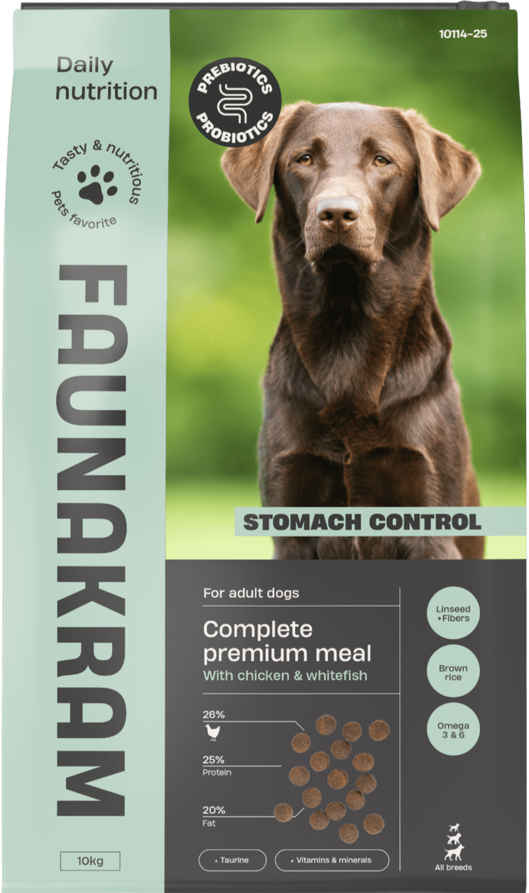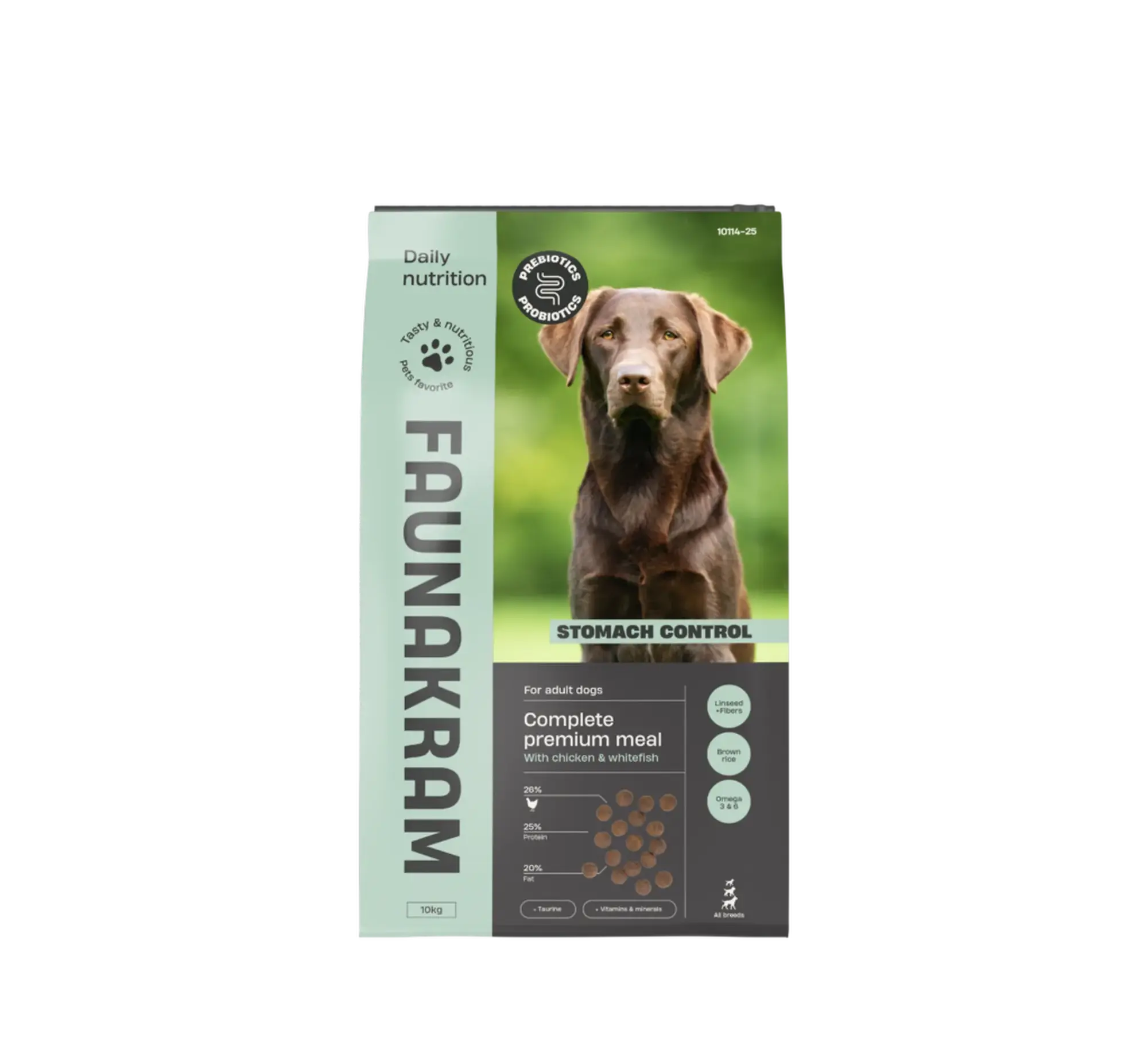 Faunakrams komplette tørfoder STOMACH CONTROL er specielt udviklet til hunde med følsom fordøjelse. Med 26% kyllingeprotein, kombineret med fiskeprotein fra hvid fisk, understøtter det muskelopbygning og giver energi til et aktivt liv.