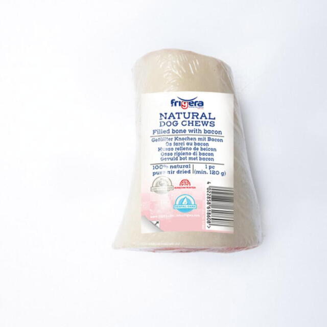 Frigera Natural Dog Chews marvben med baconfyld. En naturlig snack til hunden, der giver god beskæftigelse. Er med til at give en god tandpleje.