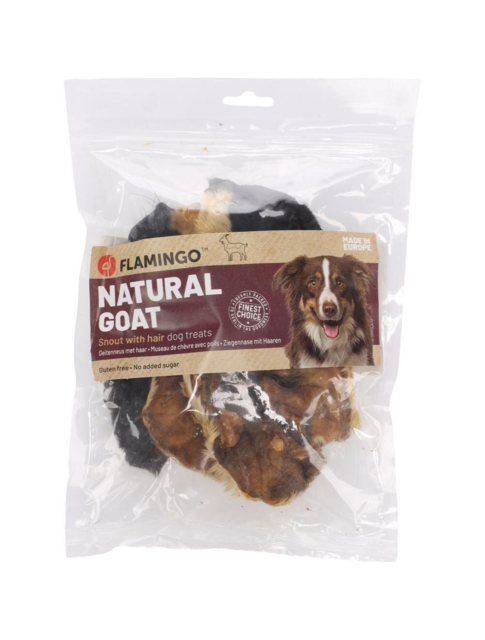 Natural Goat gedenæse med hår af mærket Flamingo. Lækre tyggesnacks lavet af ren gedenæse. Glutenfri og uden tilsat sukker, farvestoffer eller konserveringsmidler. En naturlig godbid, fremstillet i Europa.