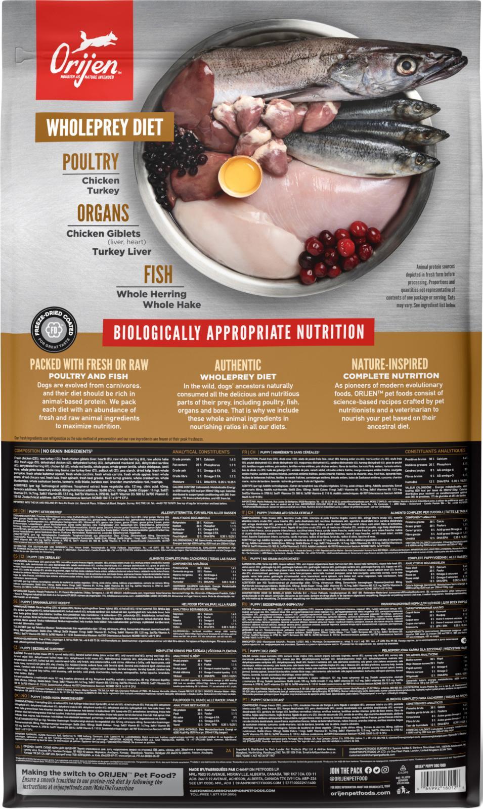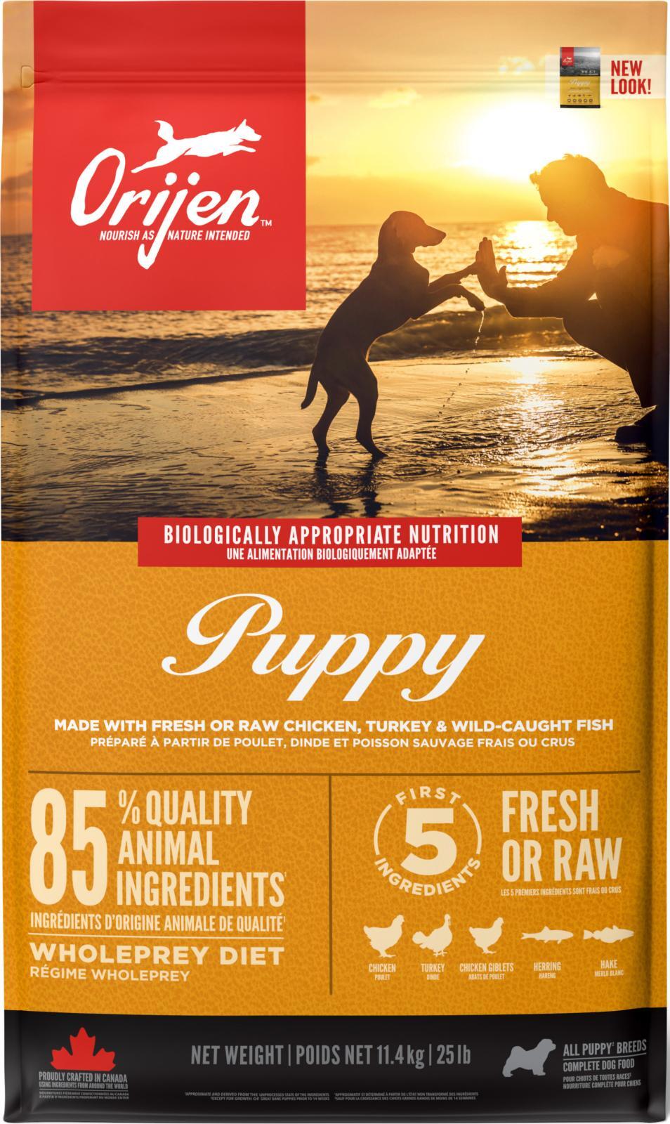 Orijen Puppy er et sundt, biologisk tilpasset hvalpefoder. Masser af kød, sunde grøntsager og frugt er de ingredienser, der giver hvalpen den rigtige start.