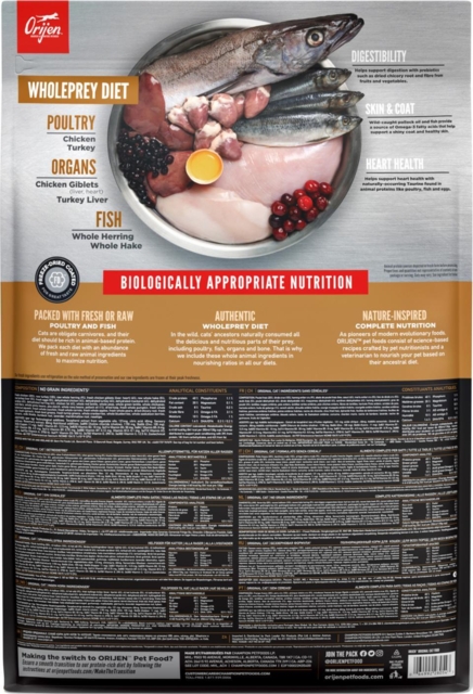 Alle katte er tilpasset en kost rig på kød og protein. Deres skarpe tænder og kropsopbygning er designet til at metabolisere protein og fedt fra kød. ORIJEN blev skabt for at nære din kat eller killing i overensstemmelse med dens biologiske behov.