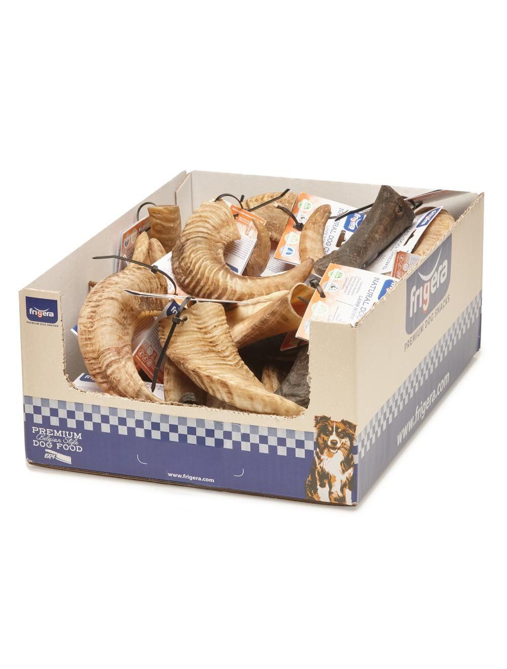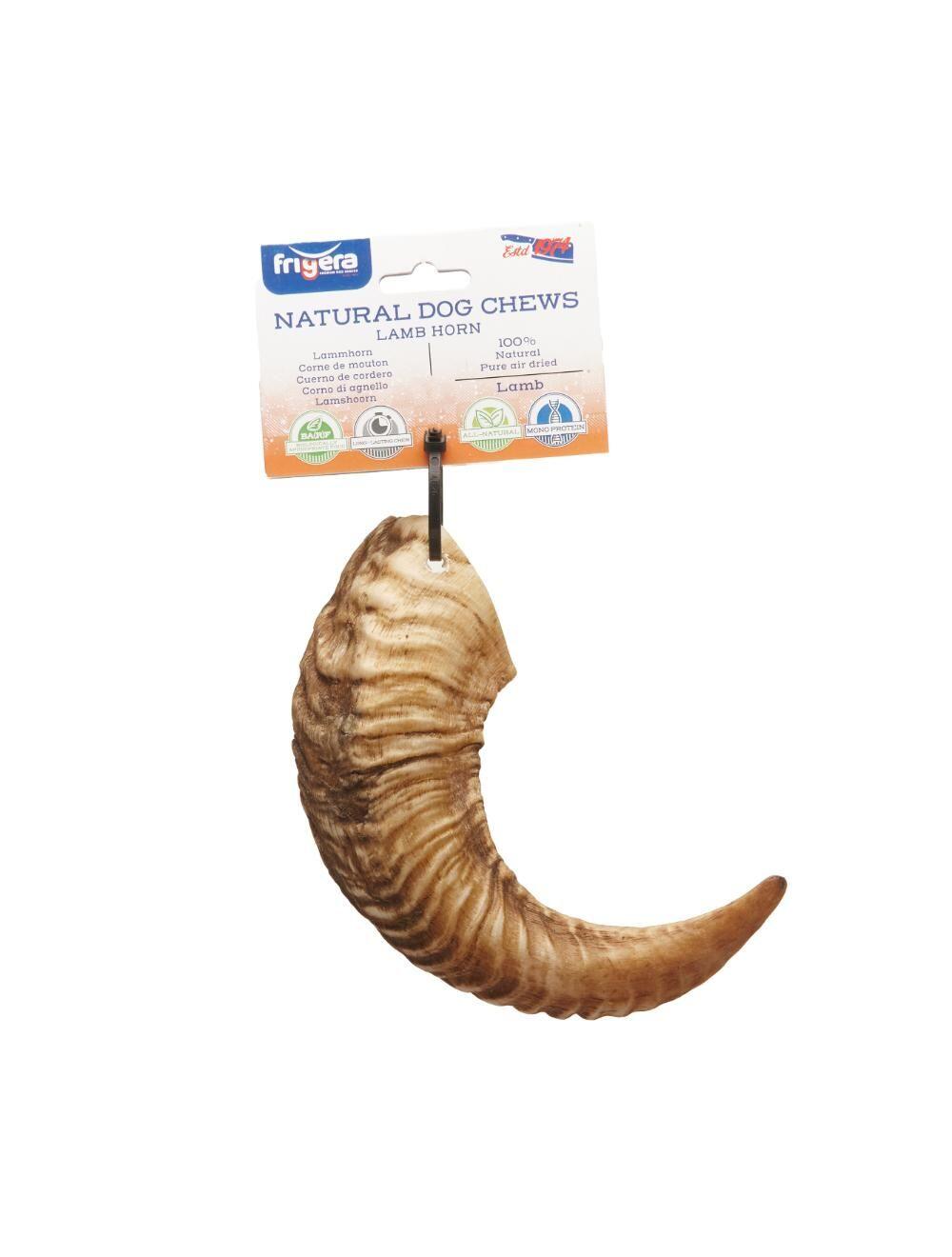 Frigera natural Dog Chews Lammehorn. Disse lammehorn kommer fra fritgående, græsfodrede lam. Hornene bliver gennemblødt i varmt vand, rengjort og slebet for at fjerne eventuelle skarpe kanter, før de omhyggeligt tørres.