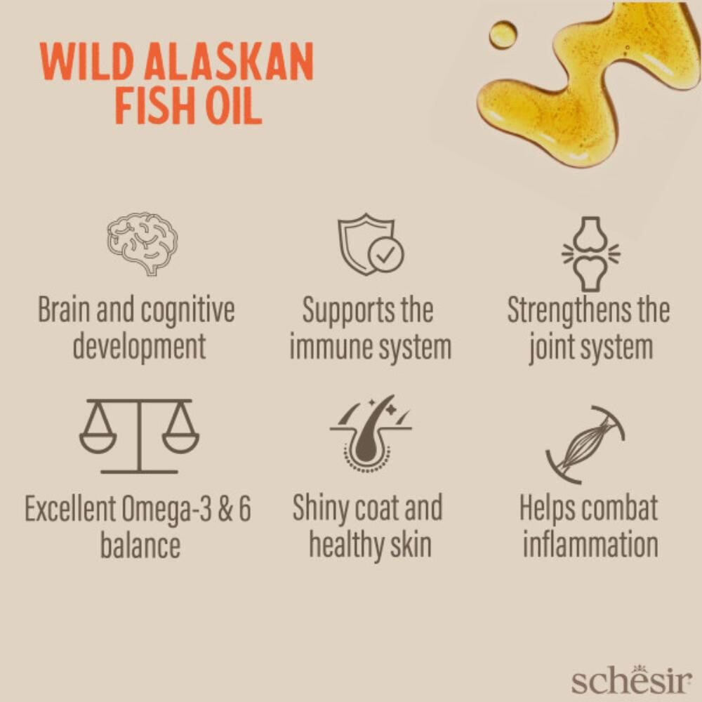 Schesir er fast besluttet på at udnytte hele fisken i deres produktion af dyrefoder, og har udviklet et parterskab med Grizzlys lakseolieproduktion til at udvinde lakseolie af deres biprodukter. Denne metode eliminerer behovet for at opdrætte fisk til at fremstille olierne, og respekterer dyrebare marine ressourcer, samtidig med at det sikrer fiskeolie af så høj kvalitet som muligt.