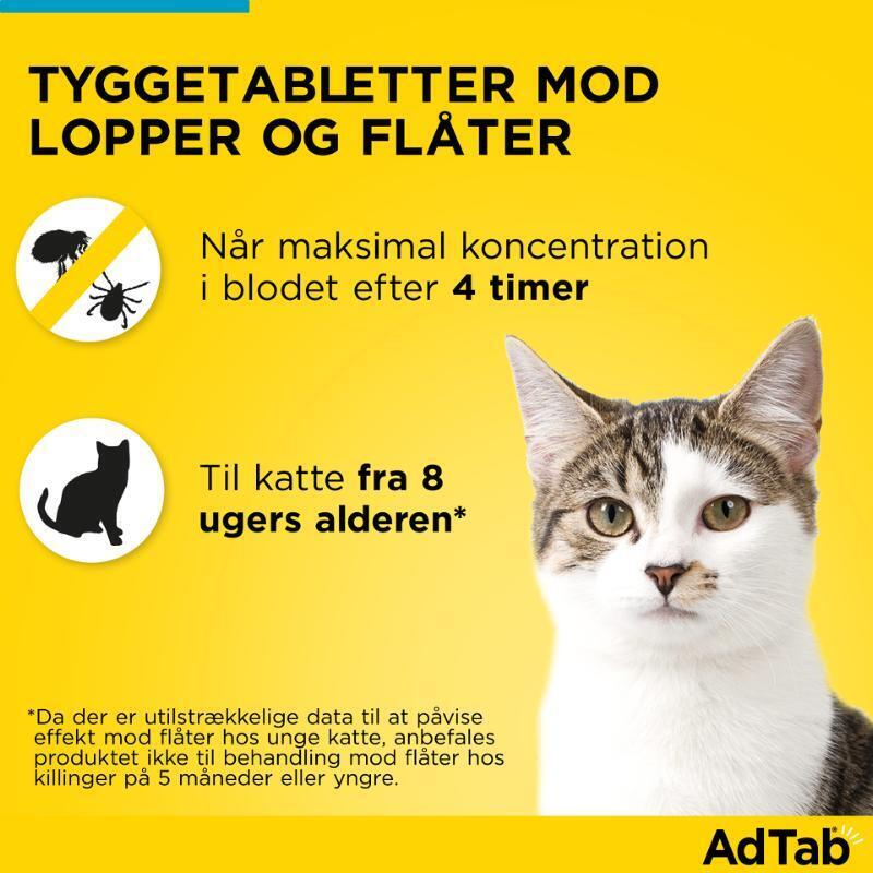 Produktet er målrettet mod lopper og flåter og fås i to størrelser, der passer til din kats vægt. AdTab er udviklet specielt til katte og har modtaget prisen "Easy to give" fra organisationen International Cat Care (ISFM), som tildeles lægemidler, der er nemme at give til katte.