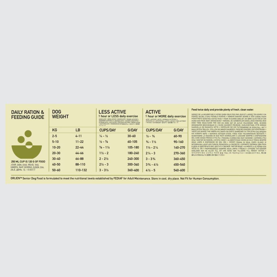 NÅR KUN DET BEDSTE ER GODT NOK. Orijen Senior biologisk tilpasset så din hund får et foder, der kommer så tæt på dens naturlige føde som muligt. Med Orijen Senior får du et sundt foder med markedets største kødindhold - 80%. Senior er sammensat af friske råvarer bestående af fritgående kyllinger og kalkuner samt friskfanget fisk. Orijen Senior er, som alt foder fra Orijen, helt fri for kornprodukter. De mange friske råvarer, der også tæller frugter, planter og grøntsager, giver en fantastisk smag, som din hund vil elske.