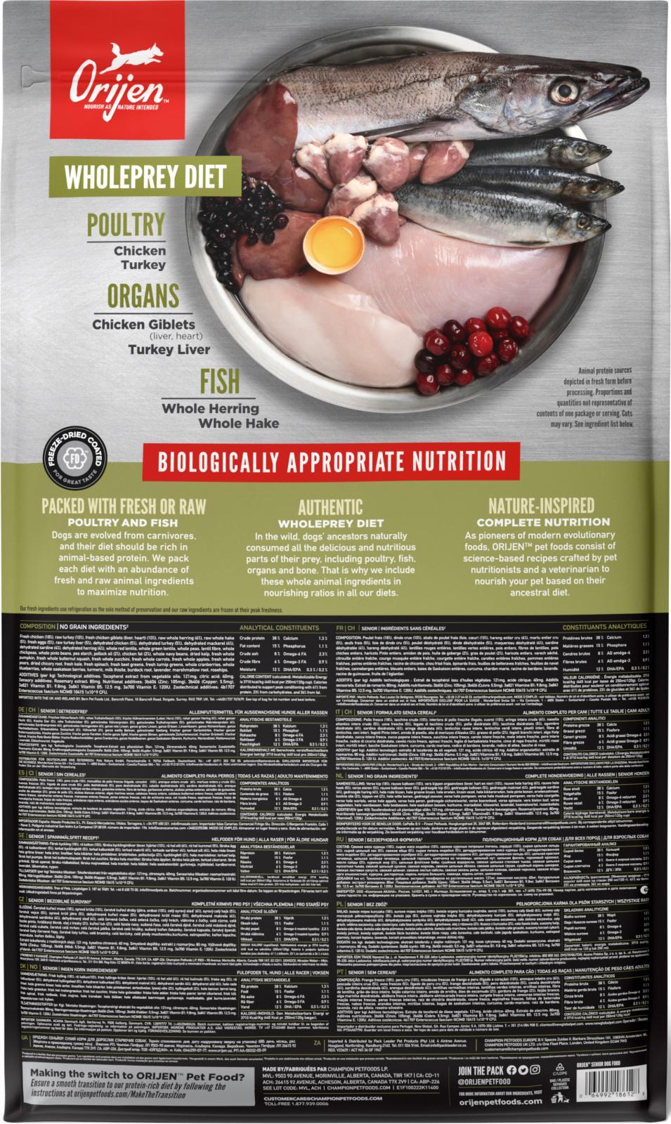 Orijen Senior - er et biologisk tilpasset hundefoder, der kommer meget tæt på hundens naturlige føde.