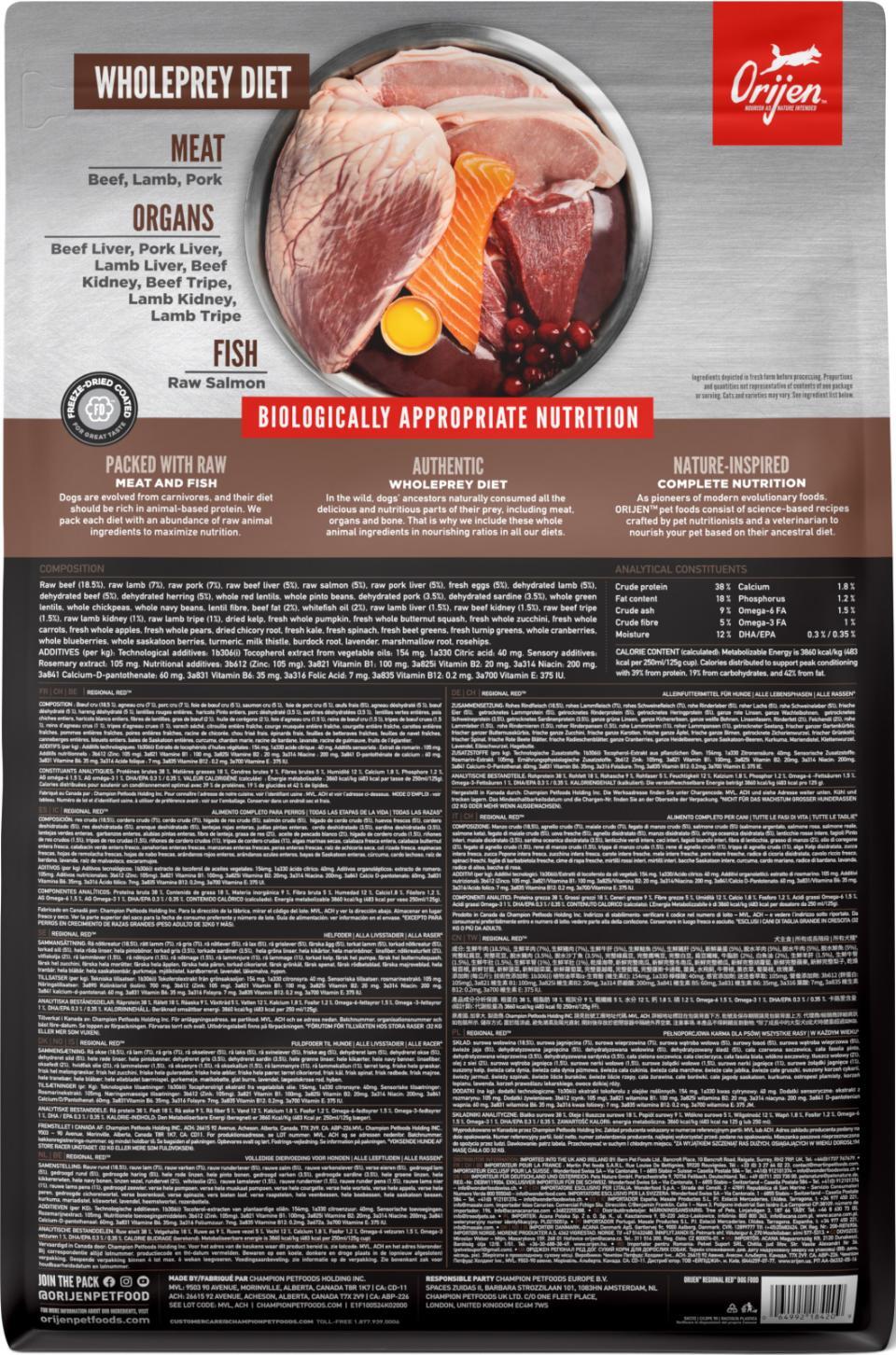 NÅR KUN DET BEDSTE ER GODT NOK. Orijen Regional Red er biologisk tilpasset så din hund får et foder, der kommer så tæt på dens naturlige føde som muligt. Regional Red er fyldt med rødt høj-kvalitets kød (75%) fra bison, vildsvin, gris og lam. Derudover indeholder foderet også vildt fangede fersk- og saltvands fisk samt friske hele æg. Råvarerne kommer alle fra staten Alberta, og bliver leveret helt frisk HVER dag, hvilket overflødiggør nedfrysning og konserveringsmidler. Indgredienser som majs, hvede og gluten er bandlylst, så derfor er Orijen Regional Red 100% kornfrit. Istedet for det usunde korn, indeholder det kun naturlige grøntsager, frugter og botaniske ingredienser, som f.eks. æbler, tranebær, pebermynte, lakridsrod og græskar. Disse gode ingredienser har hver deres gode egenskaber, nogle tilfører vigtige vitaminer og mineraler og andre fjerner uønskede giftstoffer m.m.