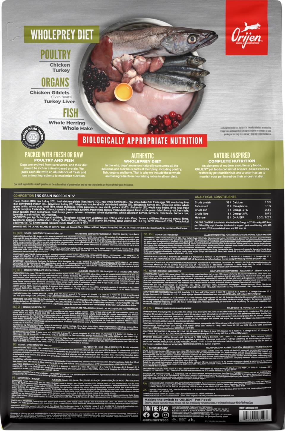 NÅR KUN DET BEDSTE ER GODT NOK. Orijen Senior biologisk tilpasset så din hund får et foder, der kommer så tæt på dens naturlige føde som muligt. Med Orijen Senior får du et sundt foder med markedets største kødindhold - 80%. Senior er sammensat af friske råvarer bestående af fritgående kyllinger og kalkuner samt friskfanget fisk. Orijen Senior er, som alt foder fra Orijen, helt fri for kornprodukter. De mange friske råvarer, der også tæller frugter, planter og grøntsager, giver en fantastisk smag, som din hund vil elske.