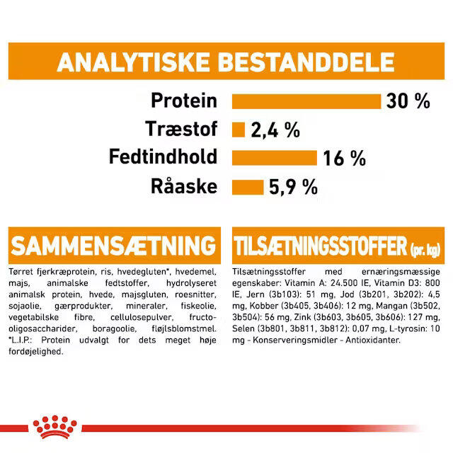 ANALYTISKE BESTANDDELE: Protein: 30,0 % - Træstof: 2,4 % - Fedtindhold: 16,0 % - Råaske: 5,9 % - Omega-3-fedtsyrer: 8,9 g/kg - Omega-6-fedtsyrer: 38,8 g/kg.