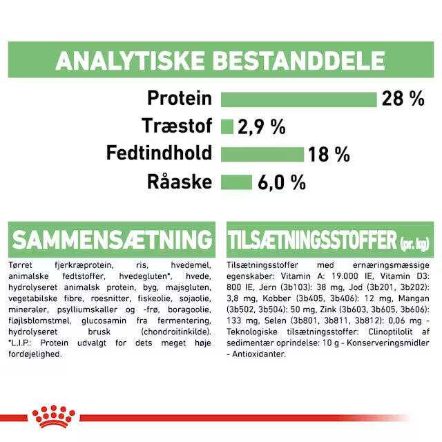 ANALYTISKE BESTANDDELE: Protein: 28,0 % - Træstof: 2,9 % - Fedtindhold: 18,0 % - Råaske: 6,0 %.