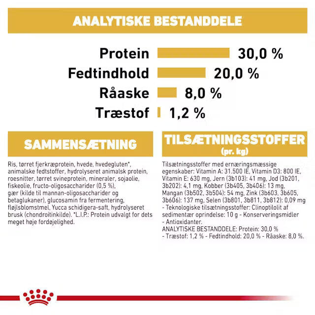 SAMMENSÆTNING: Ris, tørret fjerkræprotein, hvede, hvedegluten*, animalske fedtstoffer, hydrolyseret animalsk protein, roesnitter, tørret svineprotein, mineraler, sojaolie, fiskeolie, fructo-oligosaccharider (0,5 %), gær (kilde til mannan-oligosaccharider og betaglukaner), glucosamin fra fermentering, fløjlsblomstmel, Yucca schidigera-saft, hydrolyseret brusk (chondroitinkilde). *L.I.P.: Protein udvalgt for dets meget høje fordøjelighed.