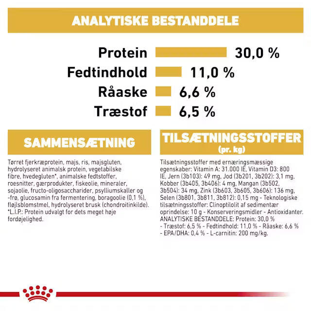 SAMMENSÆTNING: Tørret fjerkræprotein, majs, ris, majsgluten, hydrolyseret animalsk protein, vegetabilske fibre, hvedegluten*, animalske fedtstoffer, roesnitter, gærprodukter, fiskeolie, mineraler, sojaolie, fructo-oligosaccharider, psylliumskaller og -frø, glucosamin fra fermentering, boragoolie (0,1 %), fløjlsblomstmel, hydrolyseret brusk (chondroitinkilde). *L.I.P.: Protein udvalgt for dets meget høje fordøjelighed.
