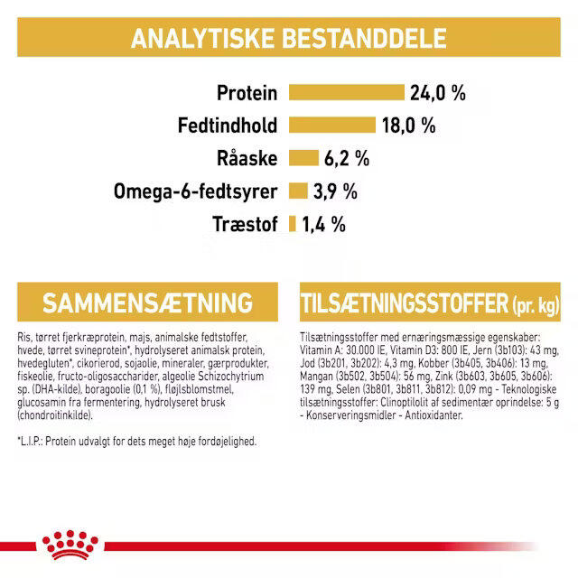 SAMMENSÆTNING: Ris, tørret fjerkræprotein, majs, animalske fedtstoffer, hvede, tørret svineprotein*, hydrolyseret animalsk protein, hvedegluten*, cikorierod, sojaolie, mineraler, gærprodukter, fiskeolie, fructo-oligosaccharider, algeolie Schizochytrium sp. (DHA-kilde), boragoolie (0,1 %), fløjlsblomstmel, glucosamin fra fermentering, hydrolyseret brusk (chondroitinkilde). *L.I.P.: Protein udvalgt for dets meget høje fordøjelighed.