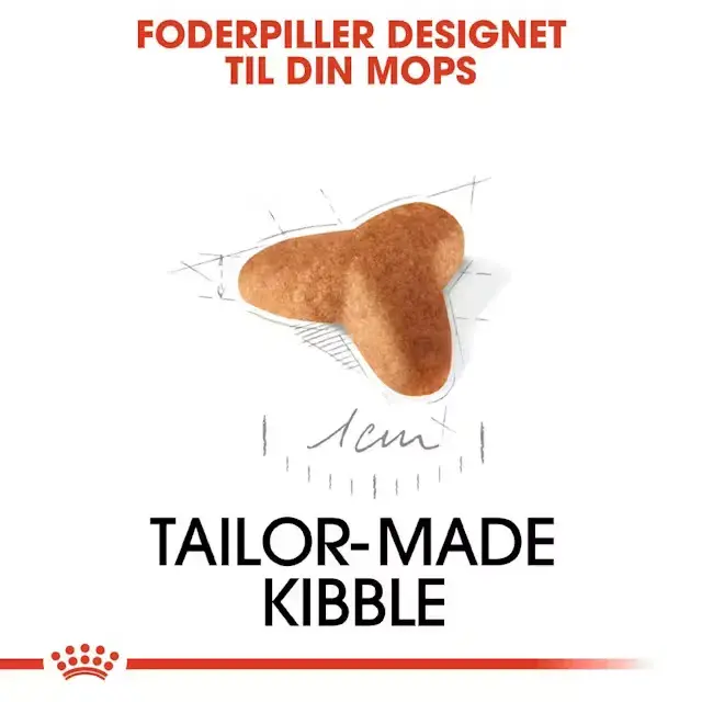 Foderpillen er skræddersyet eksklusivt til mopsracen. Mopsen kan have svært ved at samle sit foder op på grund af formen på dens kæbe og dens tykke læber. Derfor er formen og størrelsen på foderpillen i denne sammensætning specielt udviklet, så din hund har nemt ved at samle foderet op.
