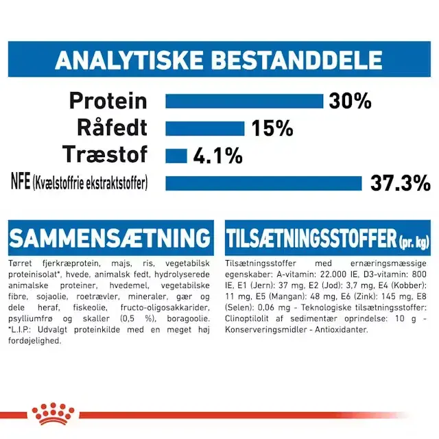 SAMMENSÆTNING: Tørret fjerkræprotein, majs, ris, hvedegluten*, hvede, animalske fedtstoffer, hydrolyseret animalsk protein, hvedemel, vegetabilske fibre, sojaolie, mineraler, roesnitter, gærprodukter, fiskeolie, fructo-oligosaccharider, psylliumskaller og -frø (0,5 %), boragoolie. *L.I.P.: Protein udvalgt for dets meget høje fordøjelighed.