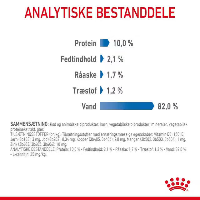 ANALYTISKE BESTANDDELE: Protein: 10,0 % - Fedtindhold: 2,1 % - Råaske: 1,7 % - Træstof: 1,2 % - Vandindhold: 82,0 % - L-carnitin: 35 mg/kg.