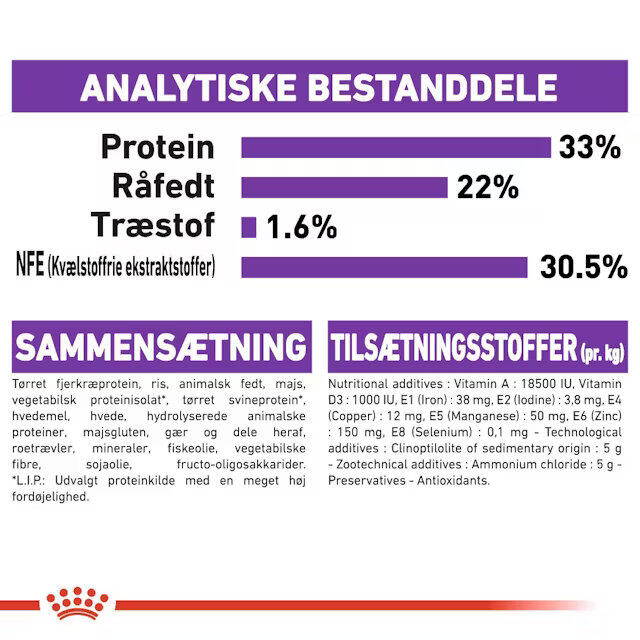SAMMENSÆTNING: Tørret fjerkræprotein, animalske fedtstoffer, ris, tørret svineprotein, majs, hvedegluten*, hvedemel, hydrolyseret animalsk protein, hvede, majsgluten, gærprodukter, roesnitter, fiskeolie, mineraler, vegetabilske fibre, sojaolie, fructo-oligosaccharider. *L.I.P.: Protein udvalgt for dets meget høje fordøjelighed.
