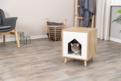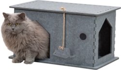 Alicia Cuddly Cave - hyggehule til katten m. fødder i bøgetræ, med plysbetræk og sisalskraberoverflade